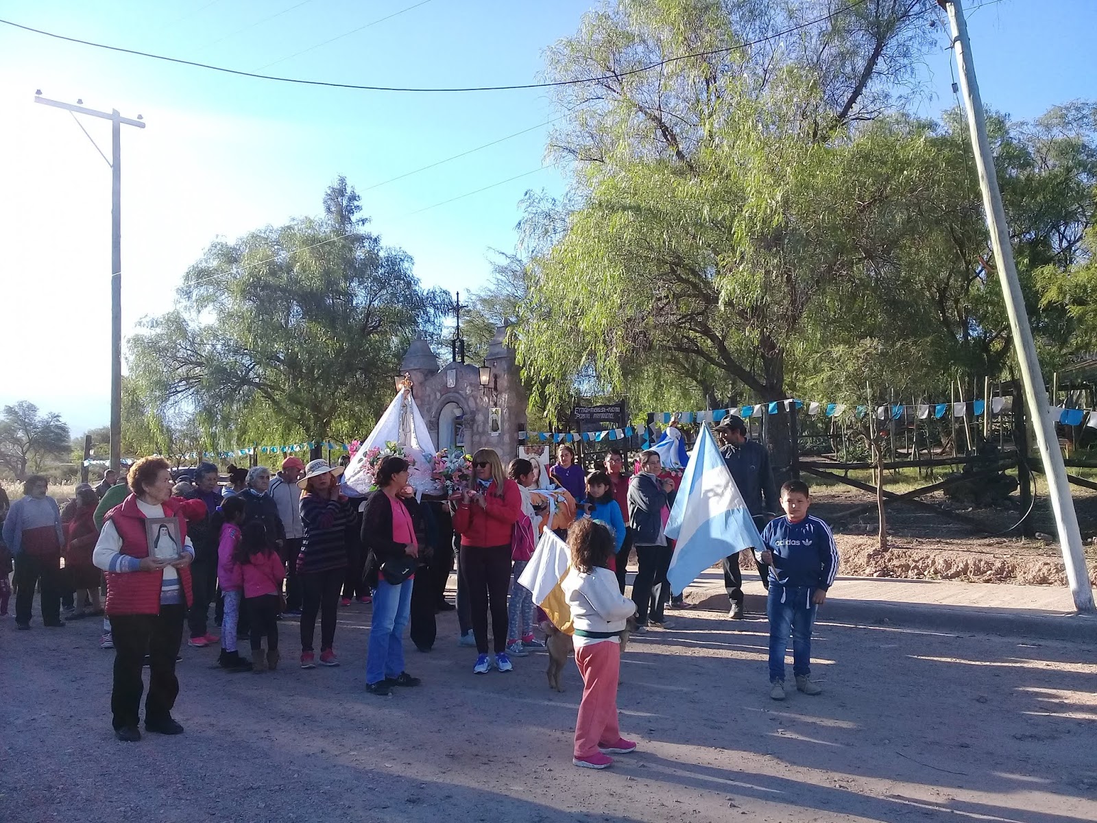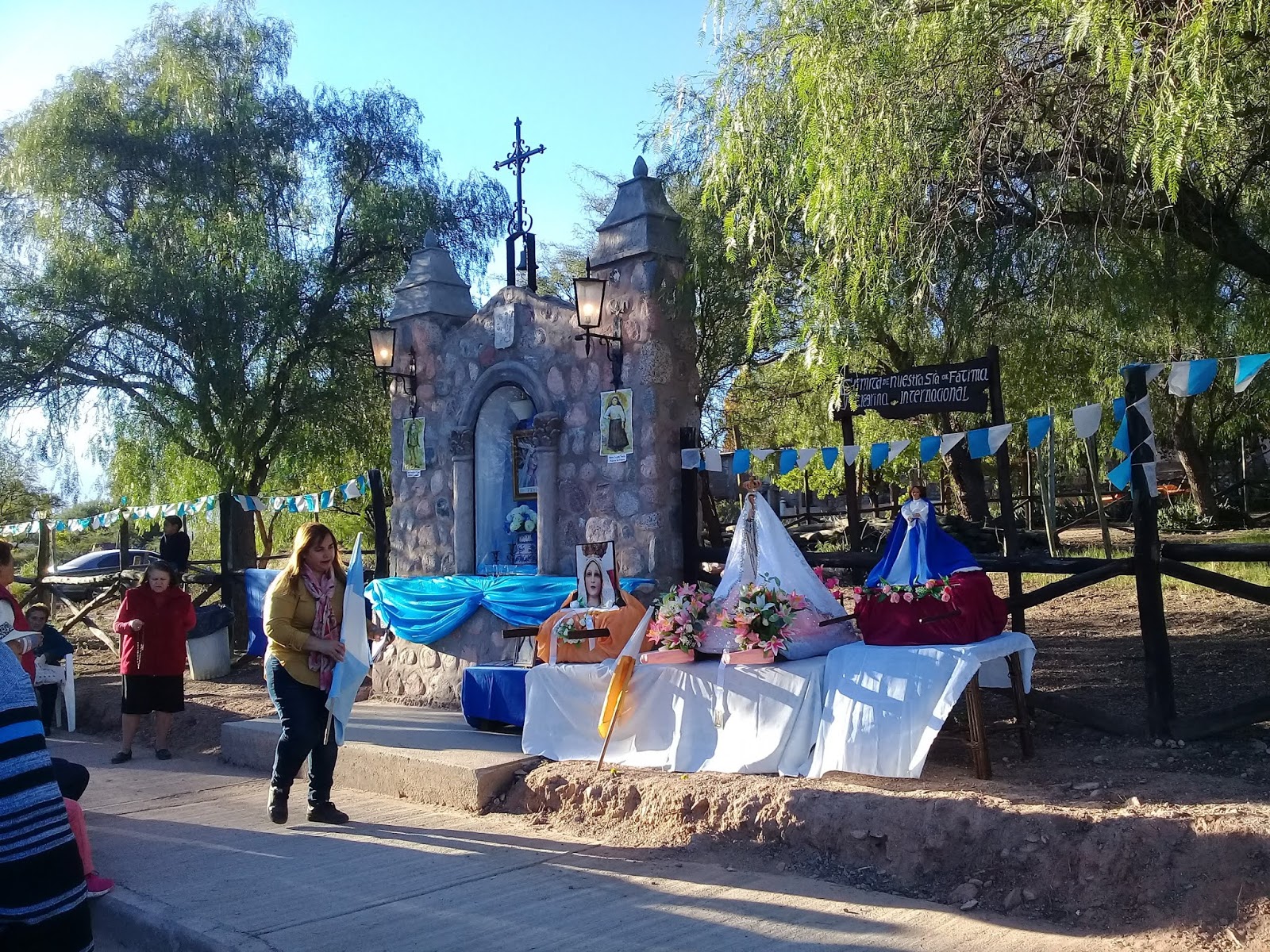| La ermita de la Imagen Peregrina Internacional de la Virgen de Fátima, engalanada por los devotos. En primer plano una de las promotoras del Rosario del 13 de mayo, a quien la Sda. Imagen concedió gracias de curaciones para su madre y su persona. También estaban una madre y su hija adolescente, de Chilecito, que habían pedido curaciones y habían sido escuchadas. |